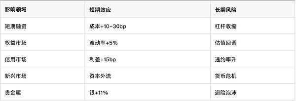 Якщо тиск триватиме, ризики включають: 1) повторення фінансової кризи 2019 року, ймовірність того, що SOFR перевищить EFFR на 75 базисних пунктів, є високою; 2) розширення продажу, крах важелів NBFI; 3) міжринкові виливи, провал аукціону на ринку облігацій.