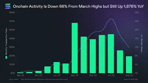 Що стосується Комісії за транзакцію, Solana досягла значного прогресу. До грудня 2023 року щомісячна частка ринку Solana за транзакцію ніколи не перевищувала 1,5%. Цей показник залишається вищим за 10% з квітня 2024 року і досяг піку в 25% у липні. Коли ми розглядаємо поради MEV як мірило «справжньої економічної цінності» (REV), Solana скорочує розрив! Графік Blockworksres, що підкреслює скорочення розриву REV між Solana та ETH.