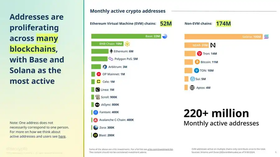 Автор встановив світову рамку як бінарну опозицію між EVM та не EVM, створивши екосистему та розробників, які не вибрали розробку в межах EVM, як «інших». Наприклад, візуальне відображення активних Адреса може бути помилковим. Кількість активних Адреса на Solana становить 100 мільйонів на місяць, що перевищує 22 мільйони на базі, але графік майже їхній рівень. Більш точним підходом буде використання однієї стовпчастої діаграми, де стовпчики EVM та не EVM розфарбовані різними кольорами (за потреби). Крім того, презентація стверджує, що «Base і Solana» мають найбільшу кількість активних Адреса на місяць, але уважний читач помітить, що кількість активних Адреса на NEAR Protocol становить 31 мільйон, що перевищує Base. Тому заголовок повинен бути змінений на «…Solana та Near є найактивнішими».