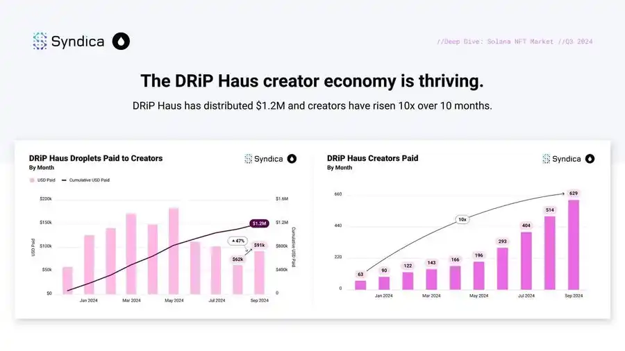 Презентація зазначає, що низька Вартість транзакції спонукає до нових способів споживання, що чудово ілюструється на прикладі drip haus. Платформа з 3 березня 2023 року відтворила загалом 182 млн Невзаємозамінний токен мінт за загальну вартість лише 1600 SOL (за ціною SOL у 150 доларів США за одиницю, це складає всього 0,001 долара США за Невзаємозамінний токен), як зазначено на ledger top.