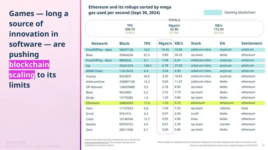 Це ще одна перспектива, зосереджена на EVM, яка стосується галузі ігор. Використання mgas/s як показника оцінки інфраструктури гри виключає Solana та інші мережі, що не є EVM, що призводить до безглуздого порівняння, що дозволяє нам побачити лише частину екосистеми ігор на Блокчейні.
