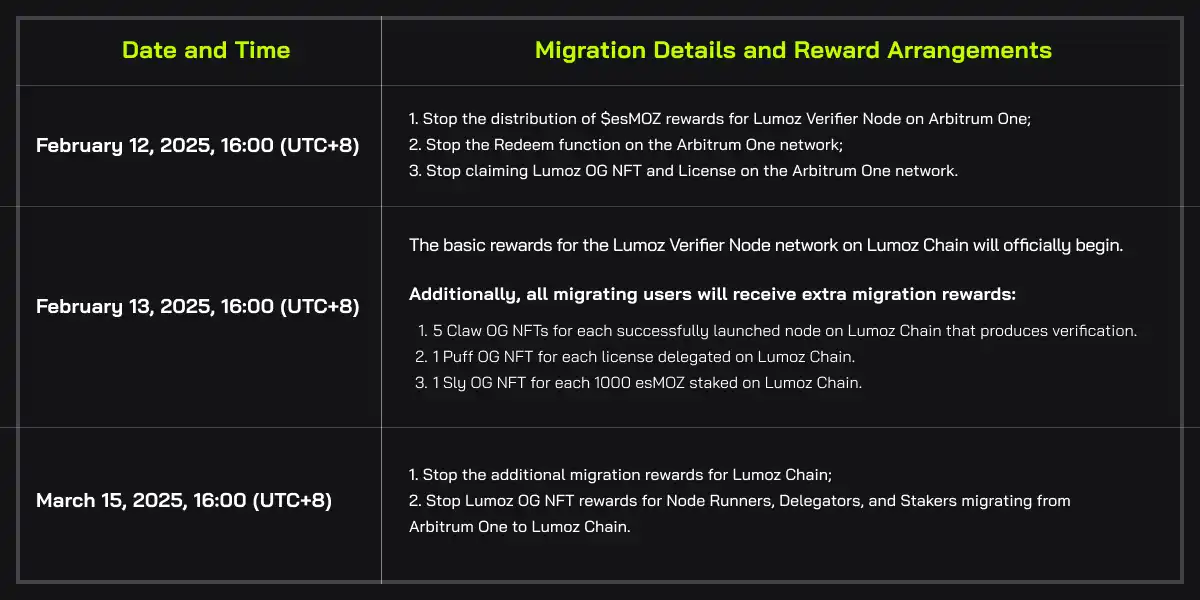 13 лютого 2025 року Lumoz Chain буде офіційно запущено, а винагороди протягом періоду міграції будуть такими: