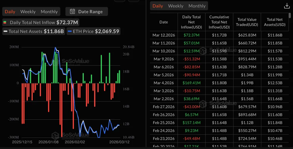 Приток у Ethereum-ETF склав $72,3 млн. З моменту запуску у фонди надійшло $11,8 млрд