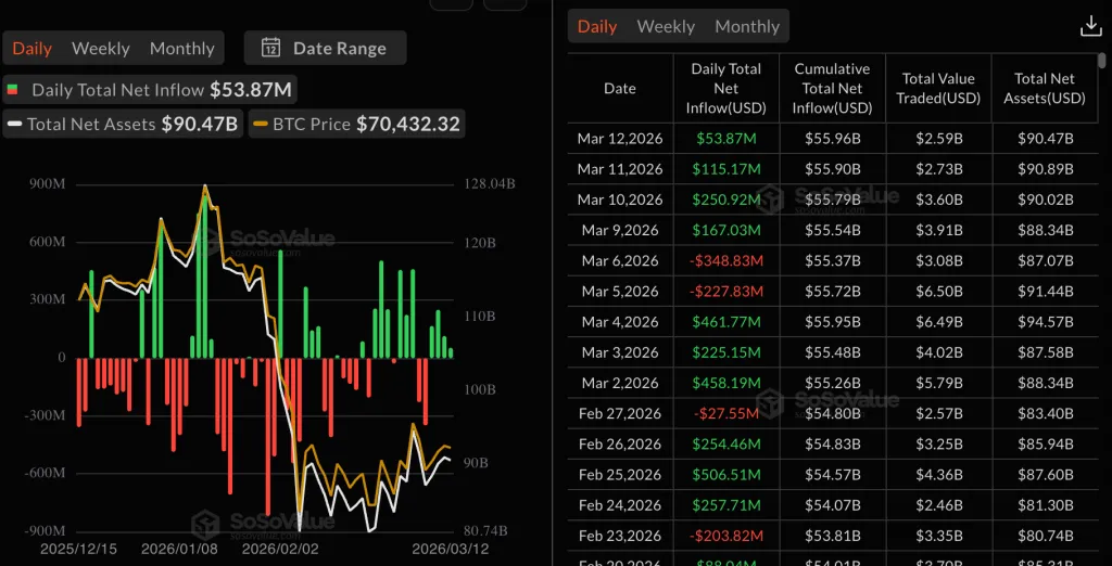 За підсумками торгів 12 березня спотові біржові фонди на базі біткоїна залучили $53,8 млн. Позитивна динаміка зберігається вже чотири дні поспіль. Загалом під управлінням цих продуктів знаходиться $90,4 млрд