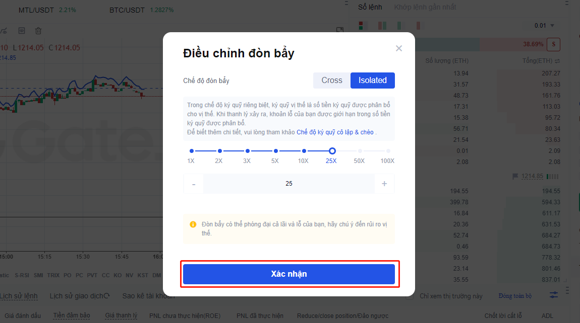 Chú ý: Lúc này điều chỉnh số lần đòn bẩy sẽ ảnh hưởng đến ký quỹ và giá cưỡng chế thanh lý của vị thế, vui lòng chú ý rủi ro của vị thế.