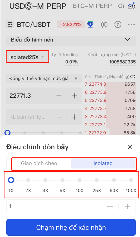 Người dùng có thể điều chỉnh đòn bẩy của hợp đồng hoặc chuyển đổi chế độ cross-margin/ isolated-margin trước khi mở một vị thế hoặc trong khi nắm giữ một vị thế.