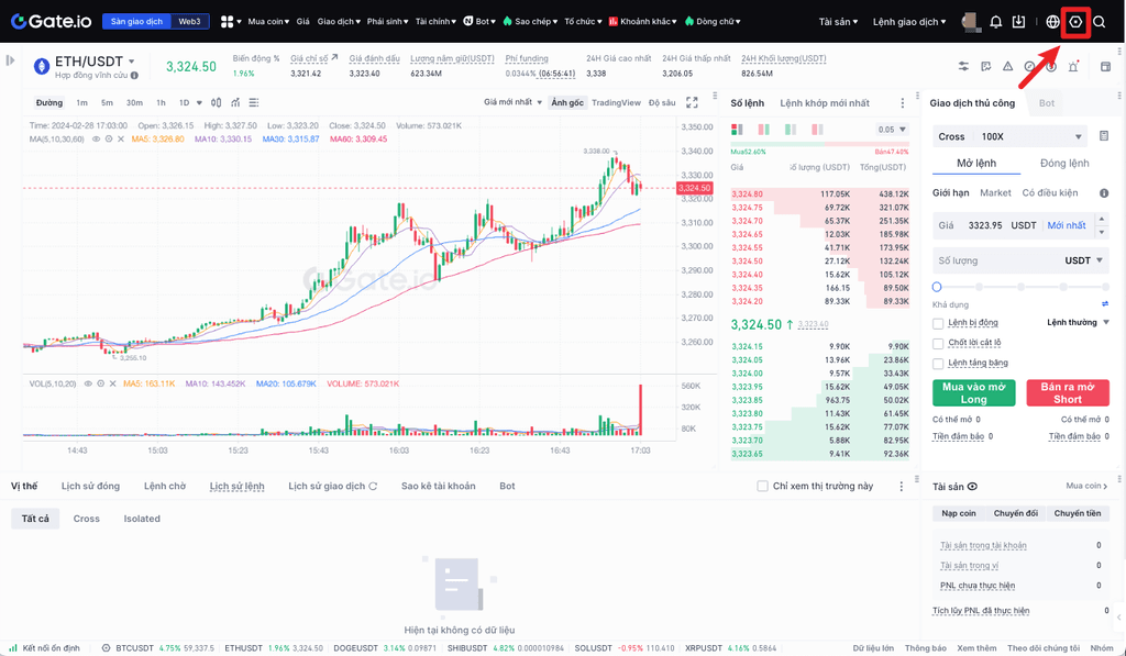 1.Ấn vào chế độ cross-margin/ isolated-margin và bội số đòn bẩy trên giao diện hợp đồng.