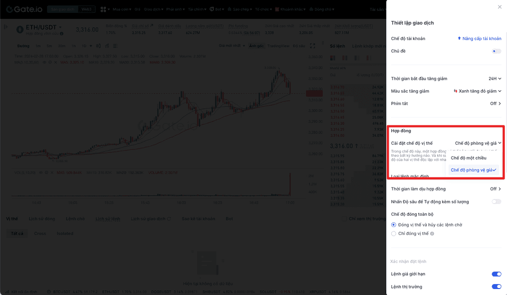 Ấn vào nút "Cài đặt" ở góc trên bên phải của giao diện hợp đồng và ấn vào "Chế độ vị thế" trong "Cài đặt hợp đồng" để chuyển đổi.