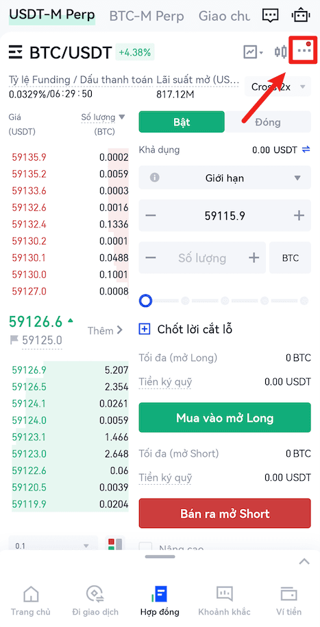 Đầu tiên, bạn nhấn vào "..." ở góc trên bên phải giao diện hợp đồng vĩnh cửu, chọn "Cài đặt hợp đồng" - "Cài đặt chế độ vị thế" - "Vị thế hai chiều" để chuyển đổi.