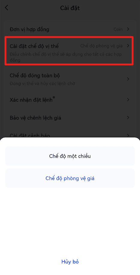 Việc chuyển đổi giữa chế độ vị thế một chiều và hai chiều có hiệu lực đồng thời đối với tất cả các hợp đồng được người dùng thanh toán bằng một loại coin.