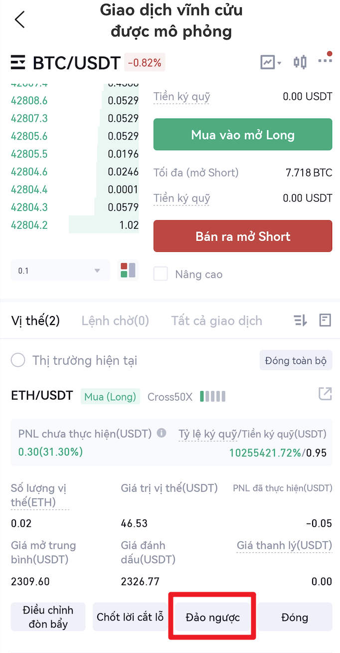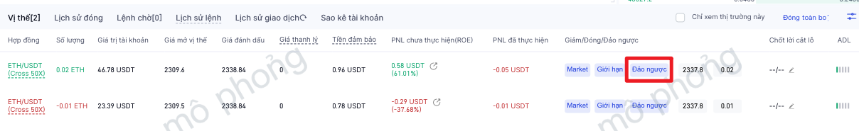 Có thể nhìn thấy nút "Đảo ngược" ở phía bên phải của “vị thế" hợp đồng.