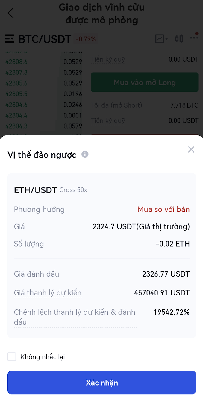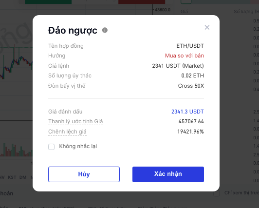 Sau khi nhấn vào nút "Đảo ngược", sẽ xuất hiện cửa sổ xác nhận thứ lần 2. Cửa sổ bao gồm các thông tin như tên hợp đồng hiện tại, hướng đảo ngược, giá ủy thác (giá thị trường hiện tại), số lượng ủy thác, v.v. Sau khi xác minh, nhấn vào "OK" để hoàn thành đảo ngược mở vị thế.