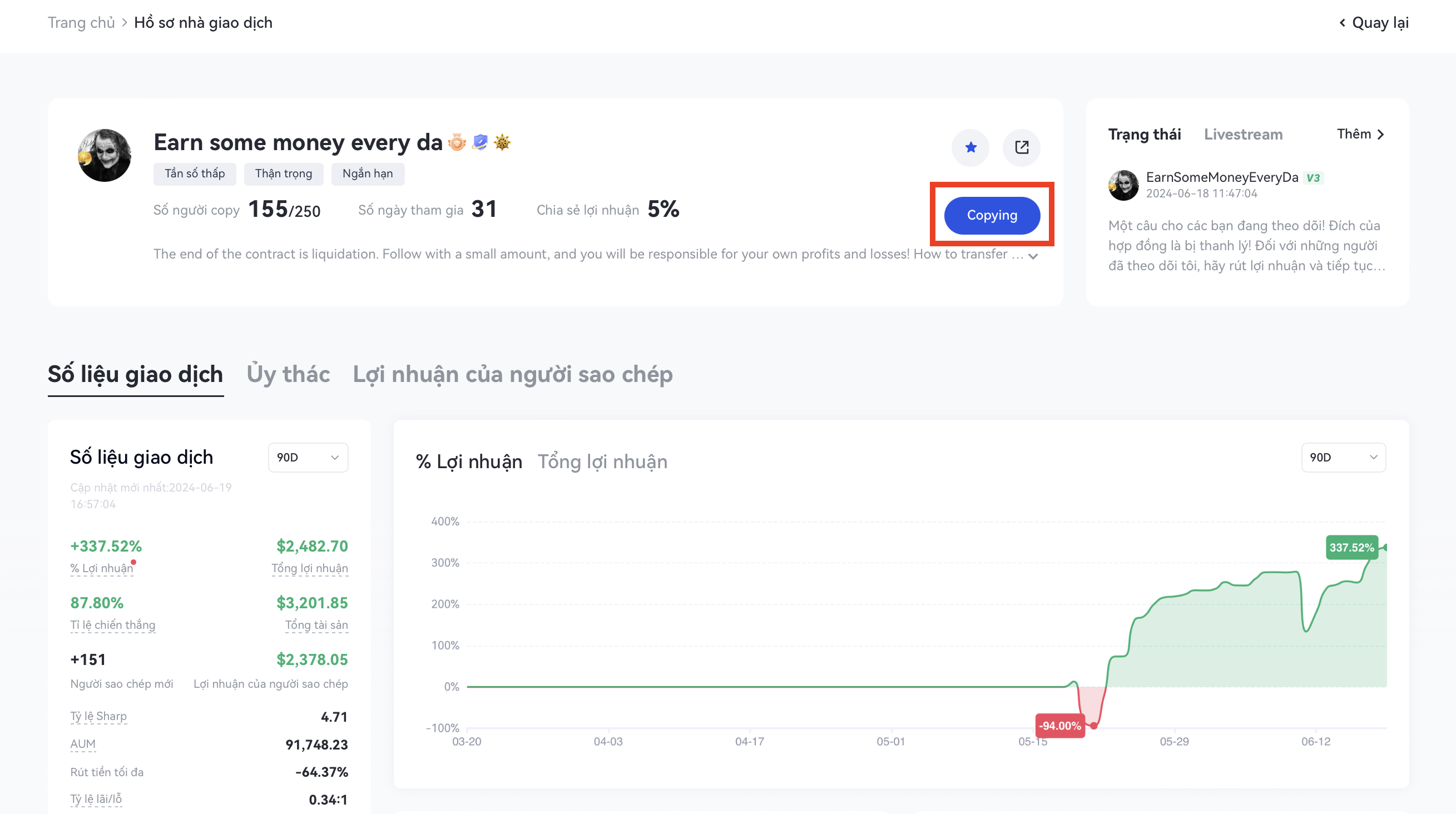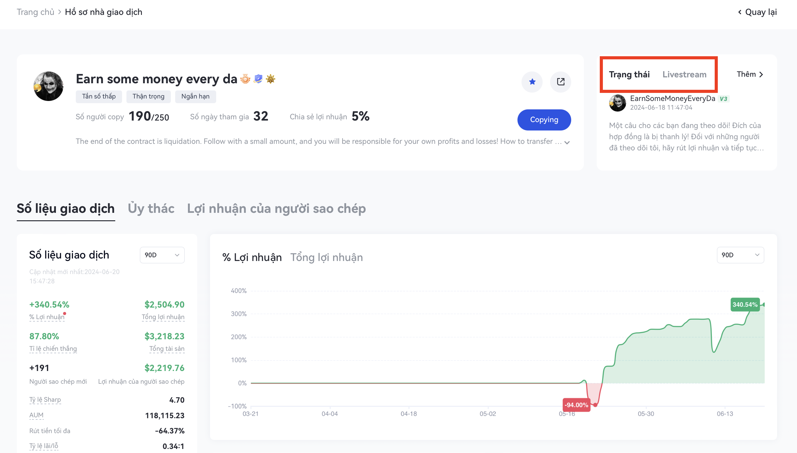 4.Trang chủ của nhà giao dịch liên kết trang trạng thái và live stream