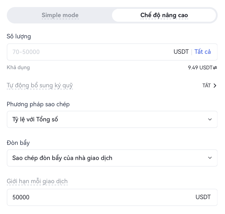 Nếu người sao chép đã mở lệnh sao chép lead trader trong quá trình sao chép lệnh, người sao chép có thể thêm ký quỹ để đảm bảo tính duy trì của lệnh sao chép, thêm ký quỹ có thể sử dụng số dư khả dụng trong tài khoản giao ngay hoặc số dư khả dụng của tài khoản sao chép hiện tại.