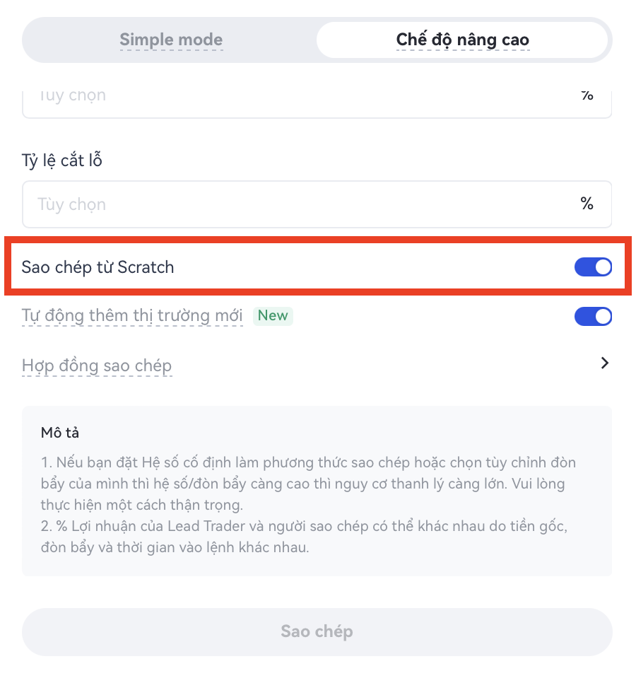 Lời nhắc: Để đảm bảo tỷ lệ lợi nhuận giữa người sao chép và lead trader gần nhau nhất có thể, người sao chép nên chọn "Chỉ bắt đầu sao chép sau khi lead trader không có vị tthế" nếu có thể.