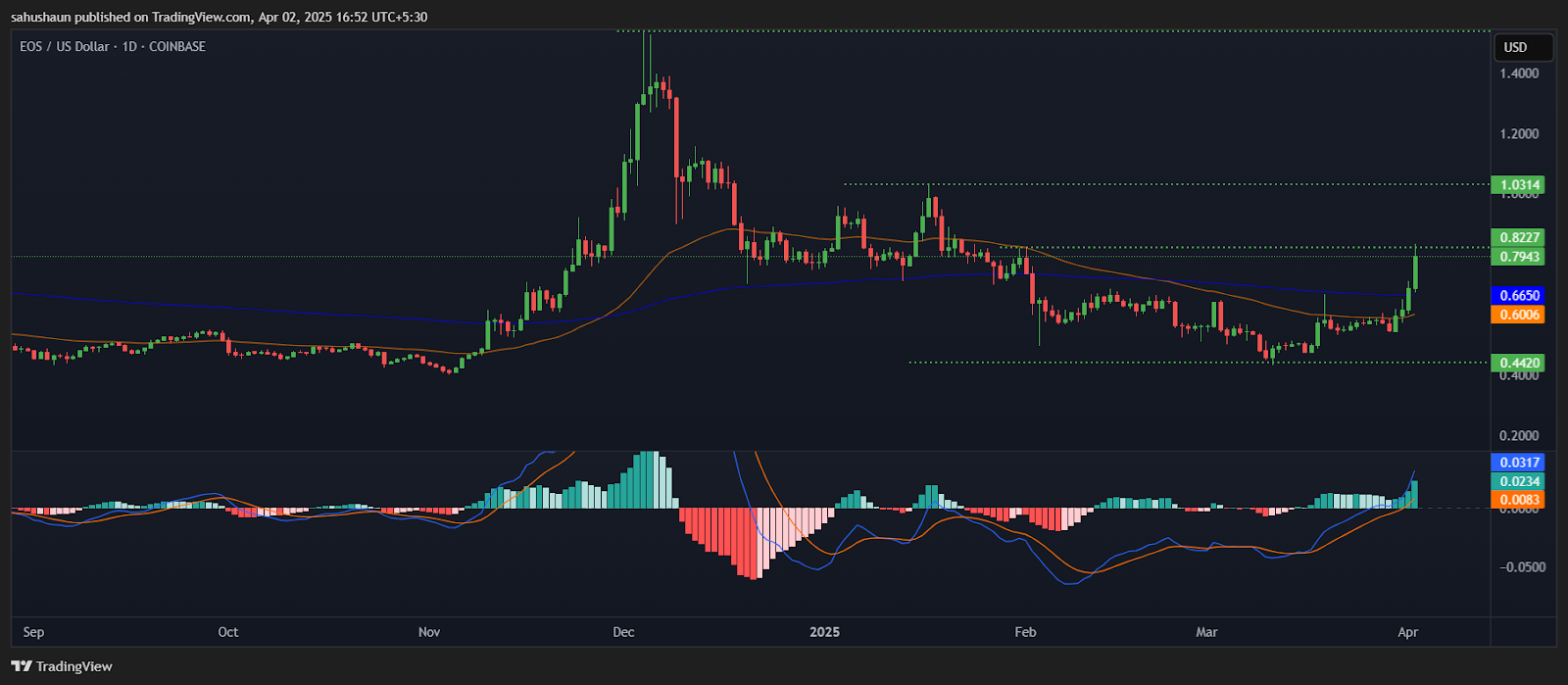 Hơn nữa, giá EOS đã vượt qua mức EMA 50 ngày và 200 ngày, điều này đã tăng cường sự tự tin của các nhà đầu tư. Sau đó, nó bắt đầu tăng lên bằng cách hình thành một cây nến marubozu mạnh mẽ và hiện tại đang cố gắng phá vỡ mức kháng cự $0.822.