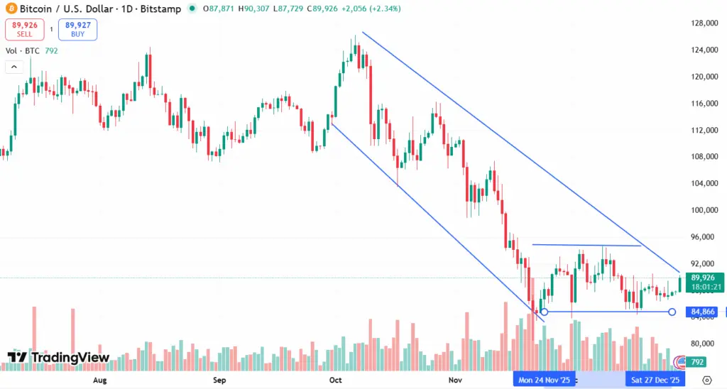 BTC giảm mạnh từ tháng 10 năm 2025 đến tháng 11 năm 2025. Xu hướng này vẫn chịu ảnh hưởng bởi chính sách thuế, đã gây ra lo ngại về lạm phát trong giới đầu tư. Tuy nhiên, token này đã duy trì một phạm vi biến động từ tháng 11 đến tháng 12 năm 2025.