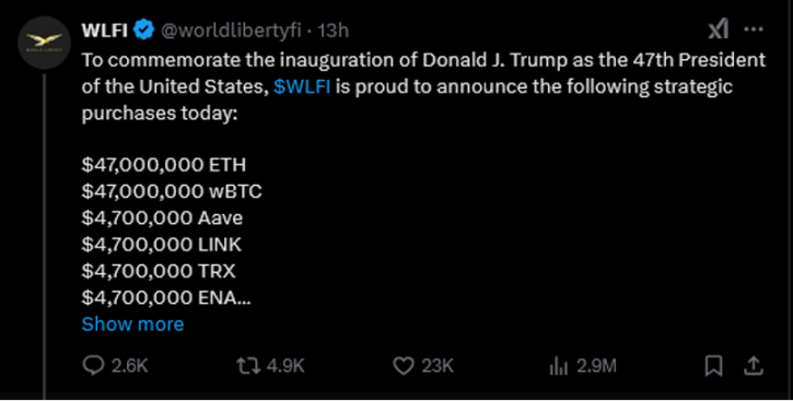 Ngoài WBTC, WLFI cũng đã thông báo mua TRX (mã token TRON của Tron) trị giá 4,7 triệu đô la Mỹ, đây là dự án đầu tiên mà WLFI đầu tư cho người Hoa. Hành động này không chỉ thể hiện tầm nhìn tiên phong của WLFI trong lĩnh vực tài sản mã hóa, mà còn phản ánh sự ủng hộ tích cực của họ đối với tài chính phi trung gian và phát triển công nghệ blockchain.