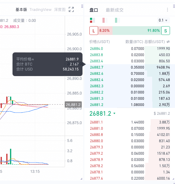 如圖所示,將光標置於所選區域,可顯示系統自動計算的所選底色區域訂單的平均價格,合計BTC數量以及合計USDT總額。