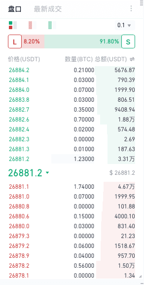 如圖所示,以BTC/USDT交易對為例,盤口買入/賣出訂單詳情包括價格(出價及要價)、數量(BTC)、總額(USDT)。除此之外,點擊總額(USDT)右側的切換按鈕,可顯示累計(BTC)及累計(USDT),用戶可以自由選擇切換查看。