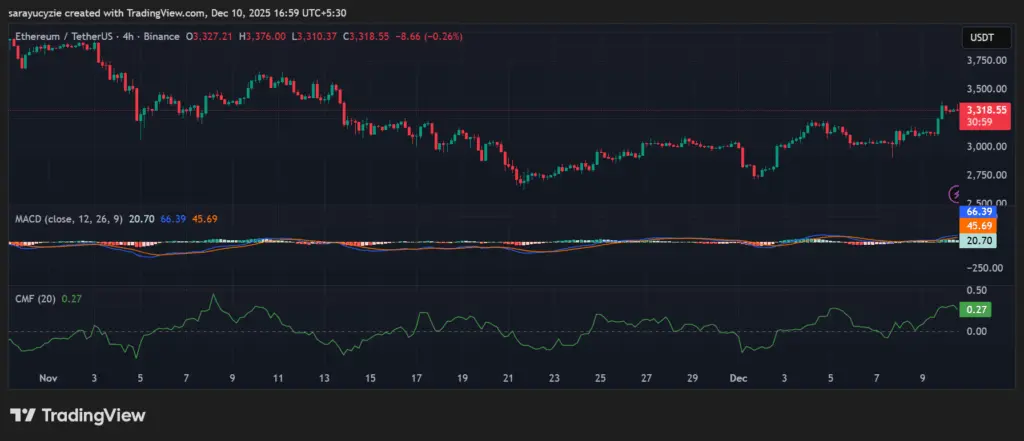 ETH的移動平均收斂發散指標 (MACD) 已經向上穿越信號線,顯示看漲動能增強。這一交叉表明買方逐漸掌控局勢,資產可能進入上升趨勢。此外,Chaikin資金流量指標 (CMF) 目前值為0.27,暗示市場中強勁的買入壓力。數值高於0表示資金流入,支持多頭偏向,並促進健康的積累。