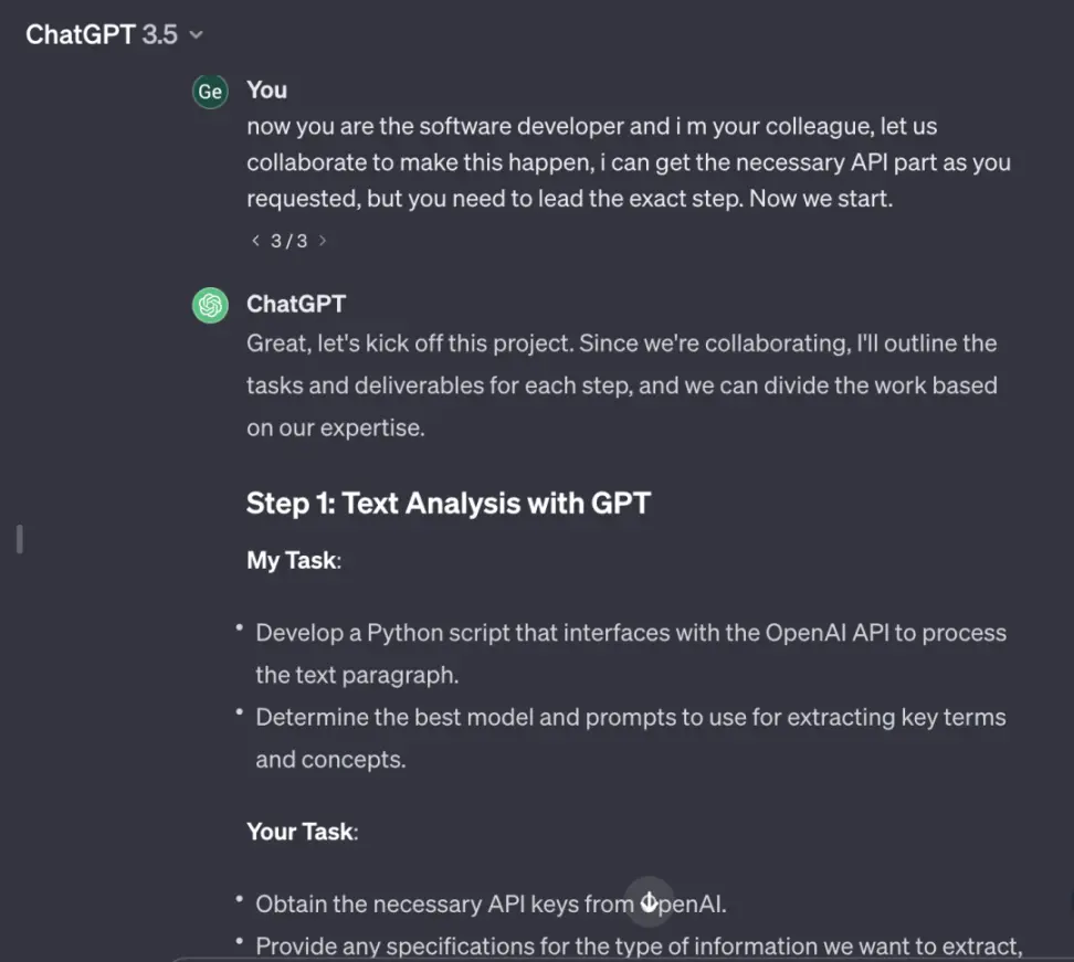 這段期間的互動關係很有趣:人同樣需要學習程式碼,但更重要的是了解各個組件的作用和他們之間的連結。例如設計一個xyz 目標的系統,KG 組織想法骨架,API 連結資料關節,我們可以更多思考連結什麼(以創造更有趣的東西或達到什麼目標),GPT 可以提供方案如何連結。我最近嘗試【和GPT 一起完成任務】的role play,其中他的角色是開發者提供代碼方案,我是API key 的搬運工(笑)和提供一些組裝哪些API 的思路: