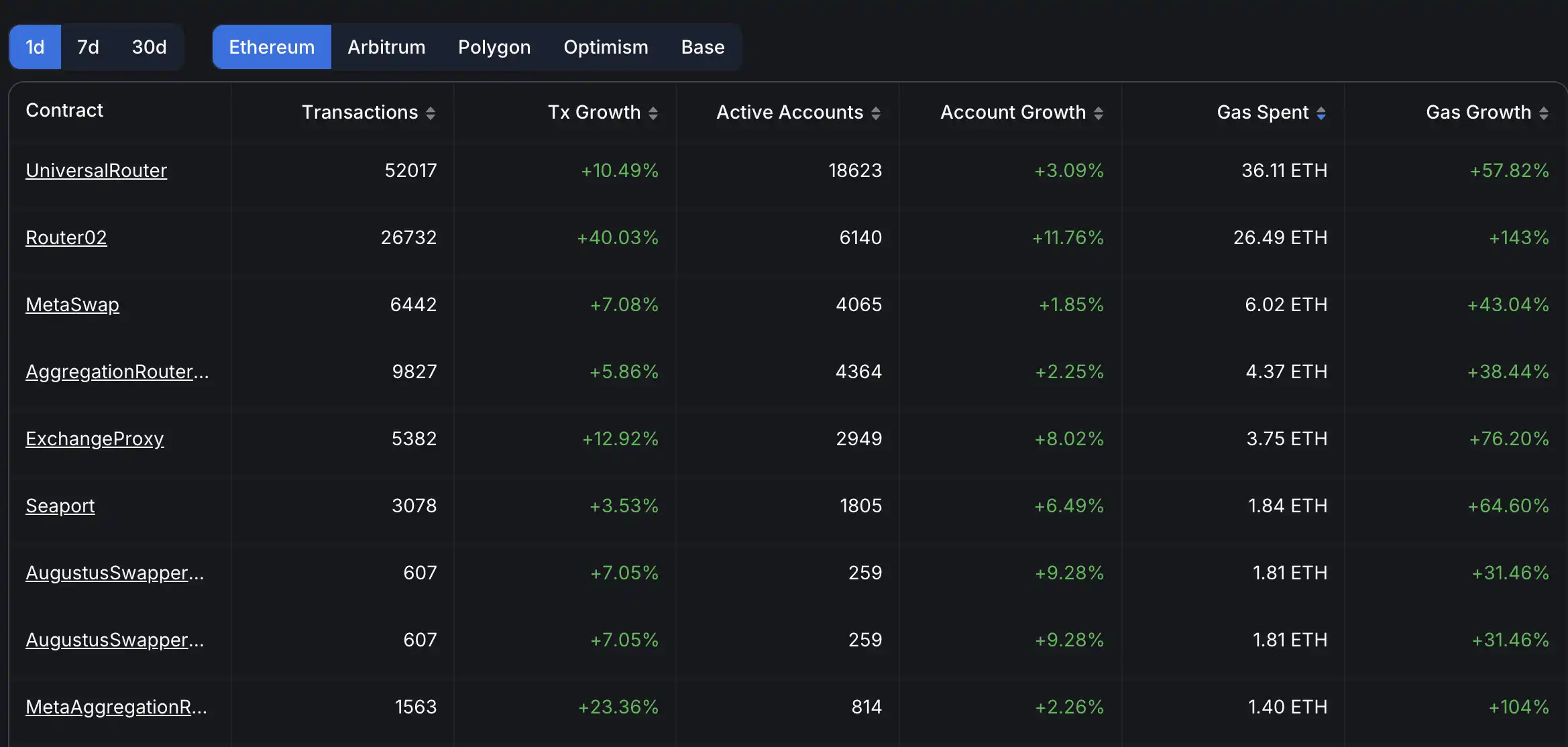以太坊生態每日合約動態觀察,按 Gas 消耗增速及部署時間篩選並排列