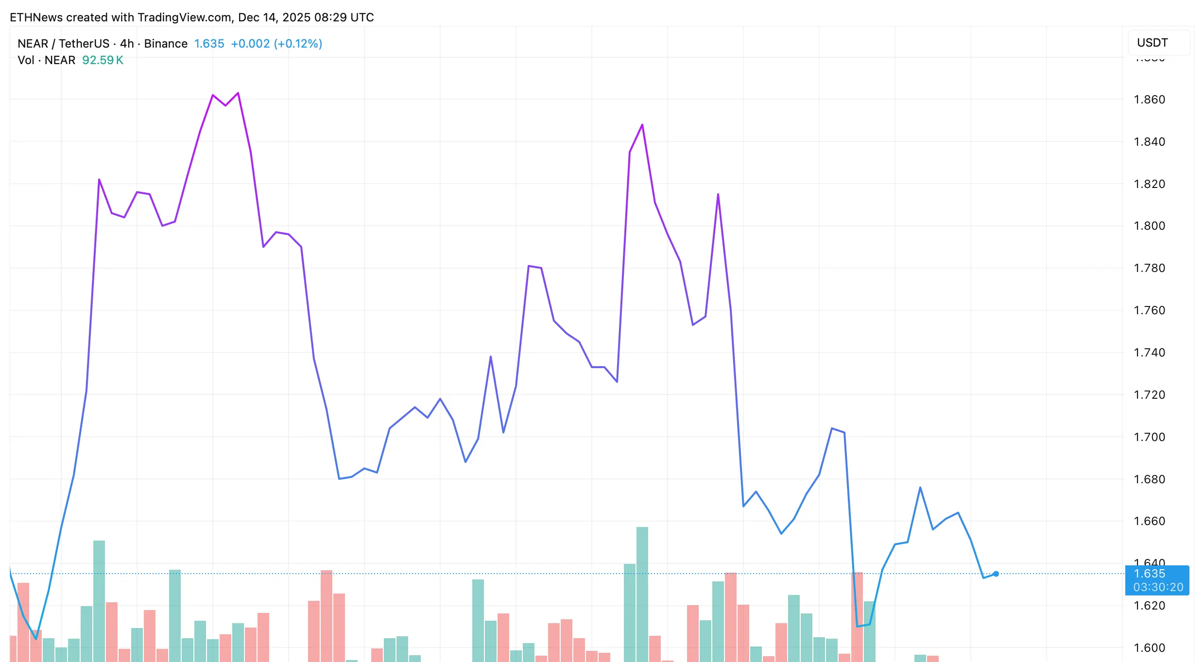 NEAR/USDT的TradingView圖表進一步支持此說法。近期的價格動作顯示出多次快速的上影線逼近阻力,以及在$1.60–$1.70區域附近的較高波動性,但未出現跌破支撐的現象。儘管4小時圖上的高點較低,但底層結構顯示買方持續進場捍衛範圍。這種盤整狀態符合分析師預期,即代幣正準備在動能回歸後迎來轉變。