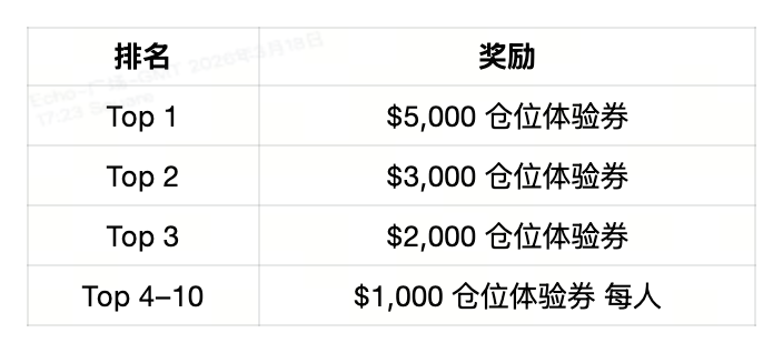 活动期间,根据发帖数量及帖子互动数据进行排名,符合条件的交易员共同瓜分 $10,000U 仓位体验券奖池,鼓励持续输出优质内容。
