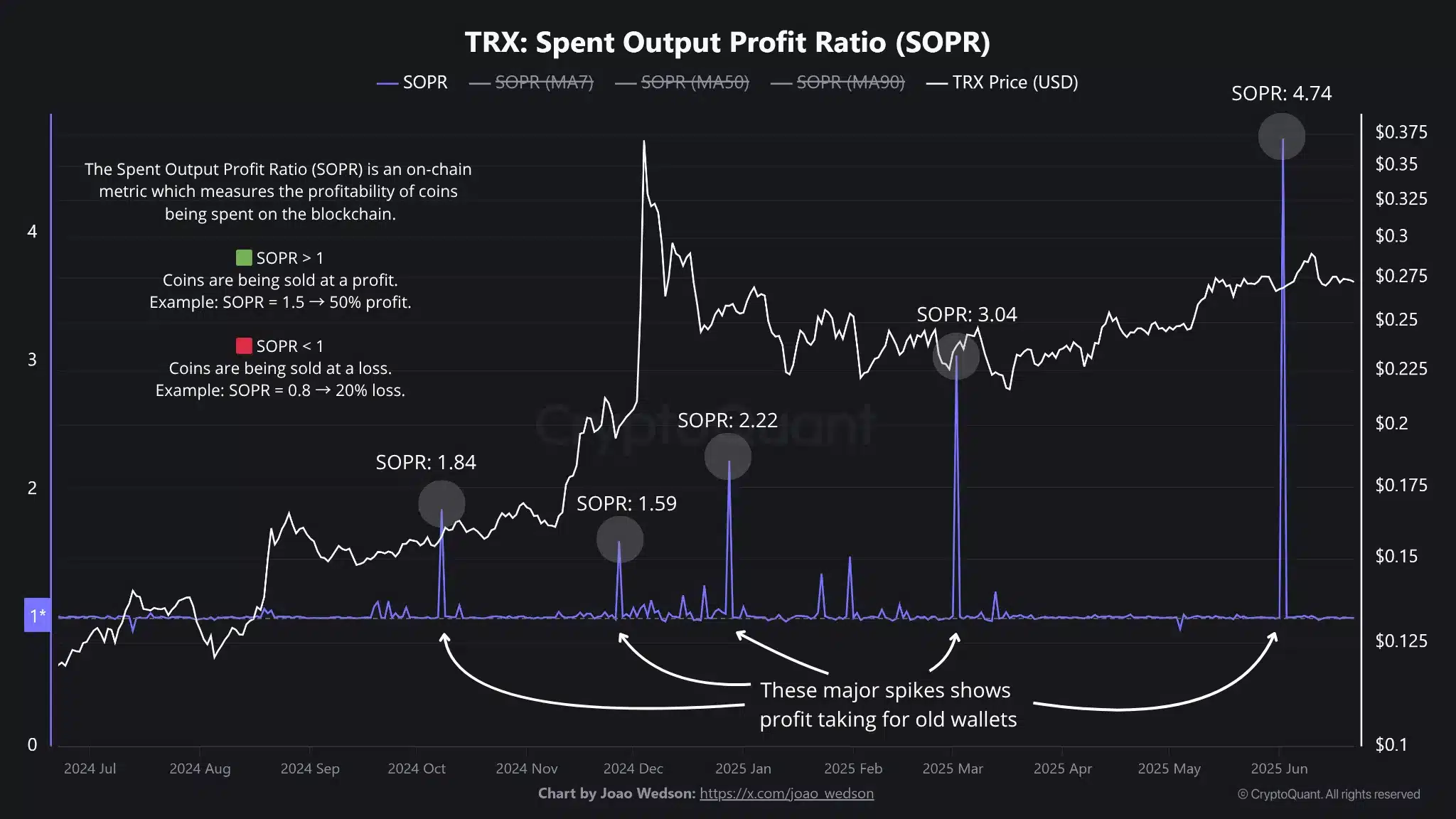 在6月初,波场(TRX)的支出输出利润比率(SOPR)飙升至4.74,创下数月以来的最高点。这个数字反映了强劲的止盈行为,特别是来自那些在$0.0566附近买入的长线持有者(LTH)。