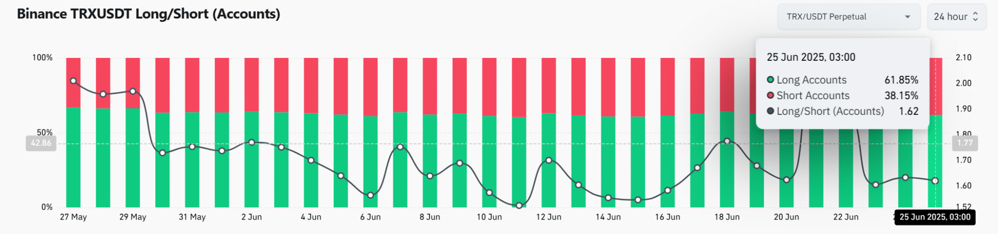 这表明虽然许多交易者期待价格上涨,但他们还没有准备好进行一次“大规模下注”。如果波场币能够保持重要的心理支撑位,或者有积极的突发新闻,动能可能会恢复。