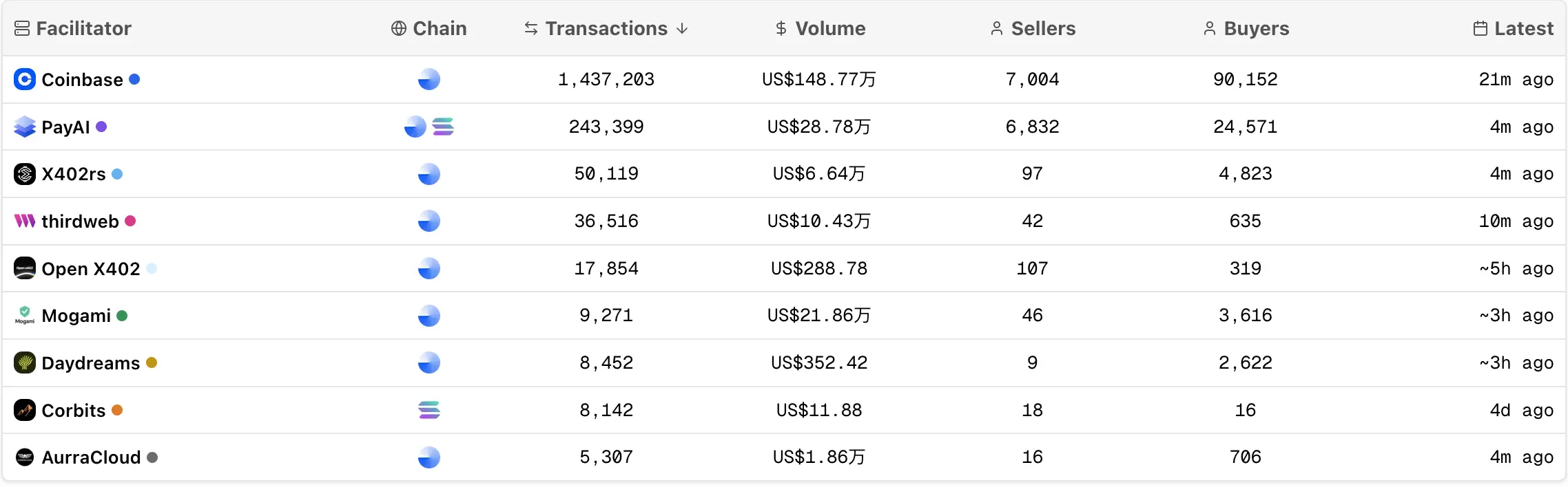 作为 x402 协议的创建者,Coinbase 运营着官方的中间人服务,并在早期阶段占据了市场的主导地位。