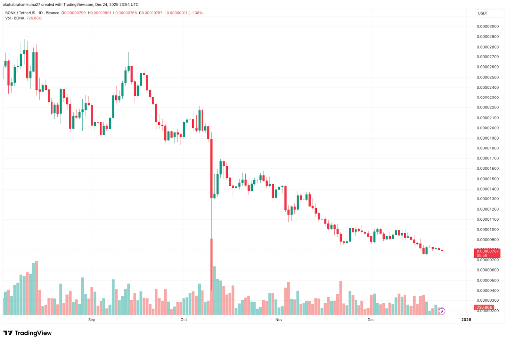 Bonk价格预测 Bonk一直是Solana表情包币趋势的代表,但最新数据显示,短期内可能已到头。截止12月24日,代币在过去七天内价格下跌了11%,表现不及全球加密市场和Coinbase 50指数。