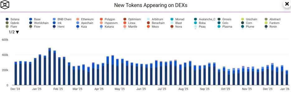 从年初的1,823亿美元起步,年中伴随着市场狂热和生态爆发,TVL一度触及2,776.2亿美元的顶点。然而,四季度的闪崩让一切戛然而止,年底数字回落至1,893.5亿美元,几乎回到原点。