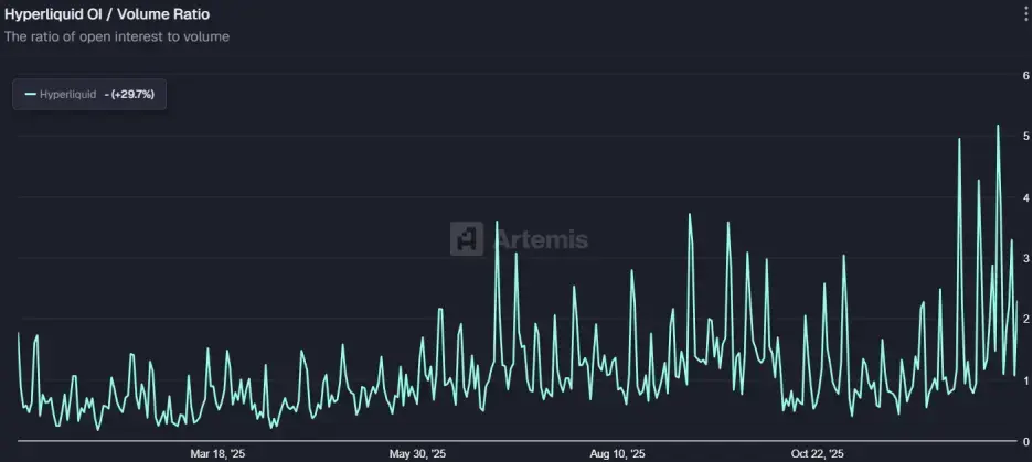 Hyperliquid是Perp DEX赛道的排头兵,其支持20万TPS和亚秒级结算,性能已与主流CEX无异,年交易量从6,175亿美元爆炸式增长至3.55万亿美元。协议的OI/Vol(未平仓量/交易量)比率长期维持在2左右的高位,表明其交易多为真实的套期保值和趋势性头寸,而非单纯的刷量挖矿。