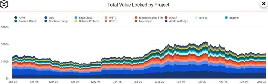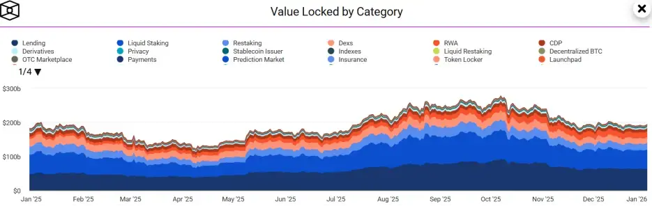 然而,第四季度一场突如其来的10/11闪崩,如冰水浇头,让TVL急剧缩水至1,893亿美元,全年涨幅被抹平至微不足道的3.86%。这场剧烈的波动,撕开了DeFi华丽叙事下的真实肌理:一边是质押、借贷、RWA等赛道的深度演化,另一边则是杠杆堆积下的脆弱性与治理割裂的隐痛。