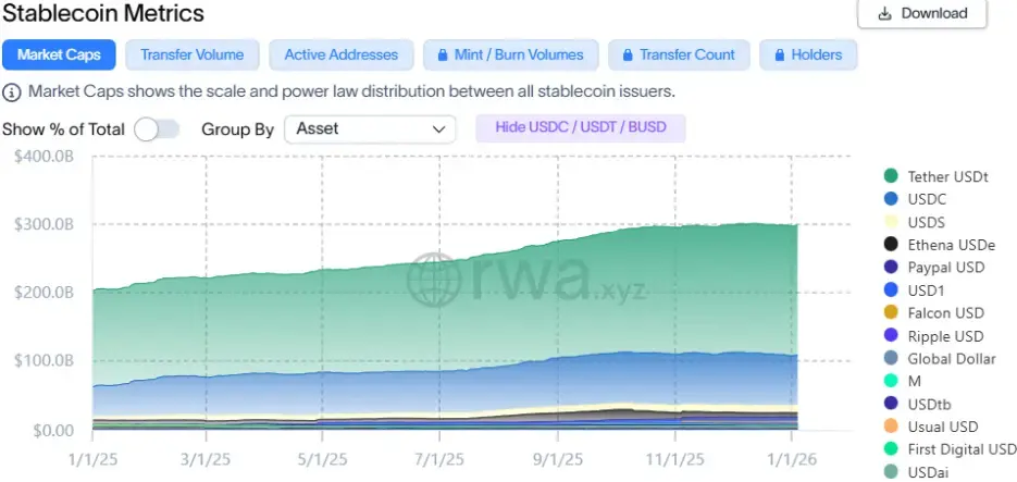 **稳定币作为DeFi的血液,在2025年迎来了规模与格局的双重演变。**总市值一度攀升至3,000亿美元,竞争格局则呈现出“双极垄断下的内部革新”。