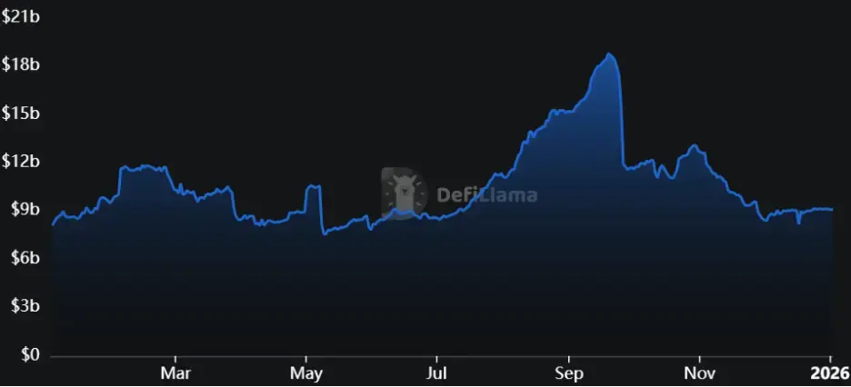 2025年是收益赛道从细分利基市场跃升为DeFi基础设施的一年,其TVL从81亿美元升至91亿美元,同比增长12.5%,年内高点约188亿美元。