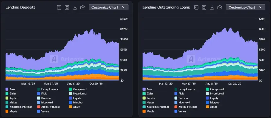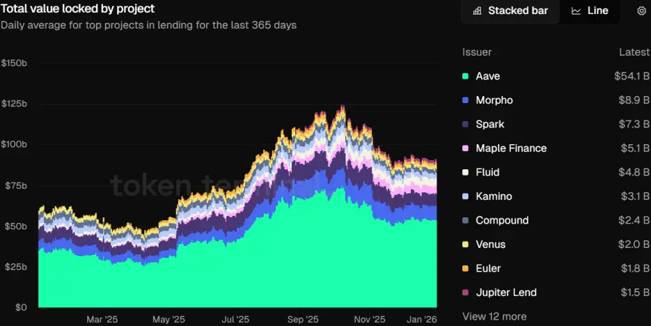Aave 以超过50%的市场份额稳坐头把交椅,即便在年底陷入“主权争夺”治理内战,其TVL也维持在540亿美元以上,展现了龙头的深厚底蕴。
