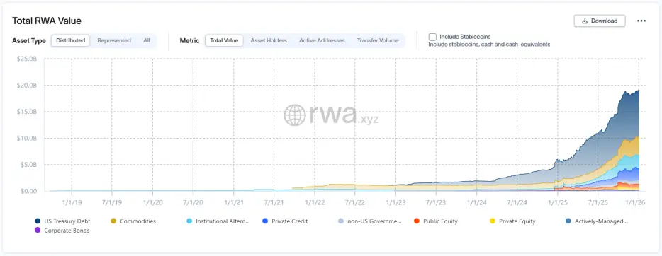 2025年,链上市场与现实资产的墙被加速推倒,是RWA实现规模化的一年。代币化资产的市值(不含稳定币)从56亿美元飙升至200亿美元以上。