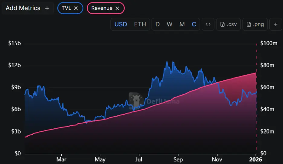 2025年,Pendle TVL从43亿美元下滑至37亿美元,同比下降约13%。不过,其累积收入从1,799万美元稳步上升至6,156万美元,同比增长242%,体现出了协议基本面的韧性。即便在市场下行周期,Pendle依然具有稳定的创收能力。