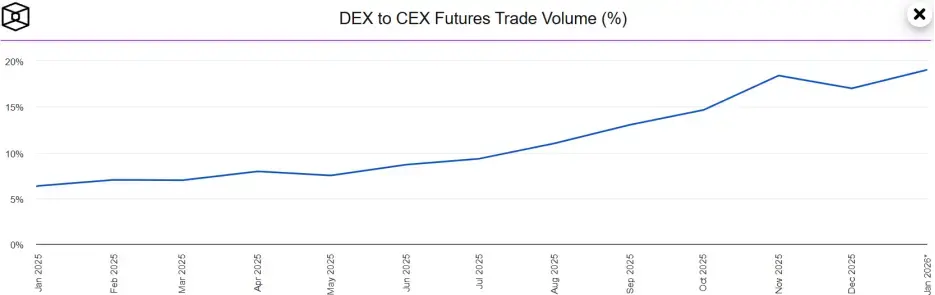 2025年,Perp DEX赛道合约持仓量超过160亿美元,交易量相对CEX的占比从6.34%跃升至17%。