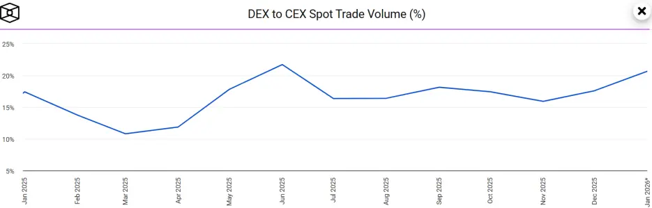 **2025年,DEX的用户粘性显著增加。**在连续八个月内,DEX对CEX的交易占比均维持在15%以上,打破了往年只有在牛市巅峰才短暂冲高的规律。
