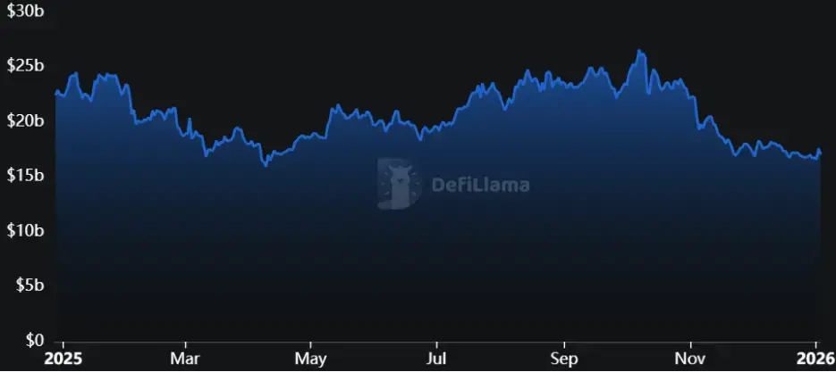 **2025年,DEX在用户体验与流动性效率上持续加速追赶CEX(中心化交易所)。**赛道TVL从223亿美元降至168亿美元,同比下滑约25%,年内高点为266亿美元。
