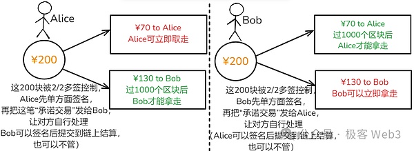 **这笔承诺交易由Bob构造,然后发给Alice让对方自行处理。**如图所示,这就是一笔比特币转账,声明把多签账户中70块钱给Alice,130块钱给Bob,但钱的解锁条件“不对称”,Alice面对的限制更苛刻,对Bob更有利。