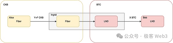 我们简单说下原理:假设Alice在Fiber网络内运行了节点,而Bob在比特币闪电网络中运行节点,Alice想向Bob转账一些钱,它可以通过跨域中转商Ingrid实现这笔转账。具体而言,Ingrid会分别在Fiber和BTC闪电网络内运行节点,充当转账路径中的中间人。