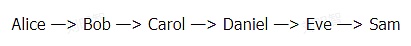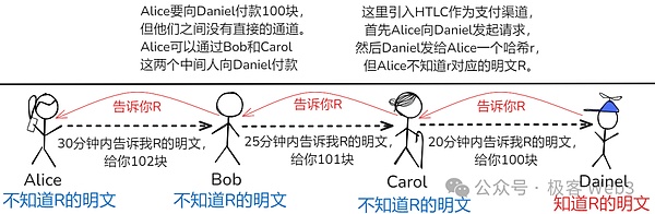之后的事情不难想象:Carol把密钥R告诉Bob,拿到101块钱;Bob再把密钥R告诉Alice,拿到102块钱。我们观测所有人的得失,可以看出Alice失去102块钱,Bob和Carol净赚1块钱,Daniel得到100块。这里面Bob和Carol赚的1块钱就是它们从Alice那抽的手续费。