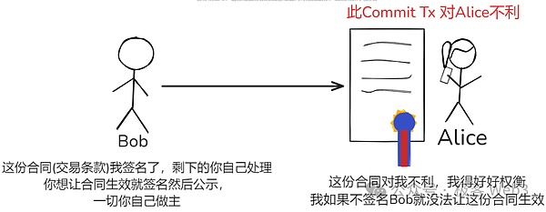 这里我们要注意:**这笔承诺交易是Bob主动构造的,其中条件对Alice不利,Alice只能接受/拒绝,我们要想办法留给Alice一些自主权。**在支付通道的设计中,只有Alice自己能把“对自己不利”的承诺交易放到链上触发,这是因为承诺交易要凑足2/2多签,Bob在本地构造交易后只有自己的签名,没有Alice签名。