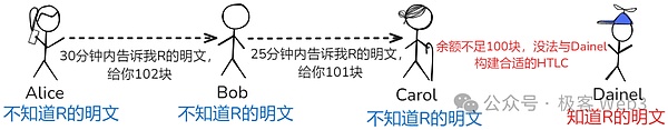假设Bob和Daniel是同一实体控制的两个节点,每天都会收到很多人发来的HTLC。它们发现,Alice和Carol每次发来HTLC后,要获知的密钥总是一致的,而与Daniel相连的下家Eve总是知道密钥R的内容。**因此Daniel和Bob能猜到,Alice和Eve之间存在支付路径,因为它们总是和相同的密钥扯上关系,**借此推断出Alice和Eve之间的关系并施加监视。