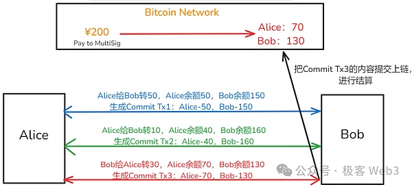 假设Alice和Bob共同开启了一个通道,他们先在链上构建多签账户,向里面存一些钱,比如Alice和Bob各存入100块,作为在链下通道中各自的余额。接下来双方可以在通道里进行多笔转账,等退出通道时,再把最终的余额同步到链上,由多签账户给双方打款,即“结算”。